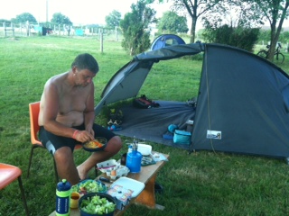“Vandaag gearriveerd met 100 mede pelgrims op camping alberge in Puenta de la Reina”. In Puenta de la Reina komen de 4 grote St. Jacobspelgrimswegen samen en vormen vanaf daar één weg richting Santiago de Compostella de “Camino francés”.